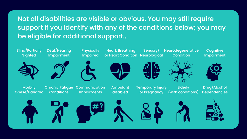 You don’t need to have a visible disability to qualify for a PEEP. Someone may qualify for a PEEP if they have any of (but not limited to) the below disabilities.